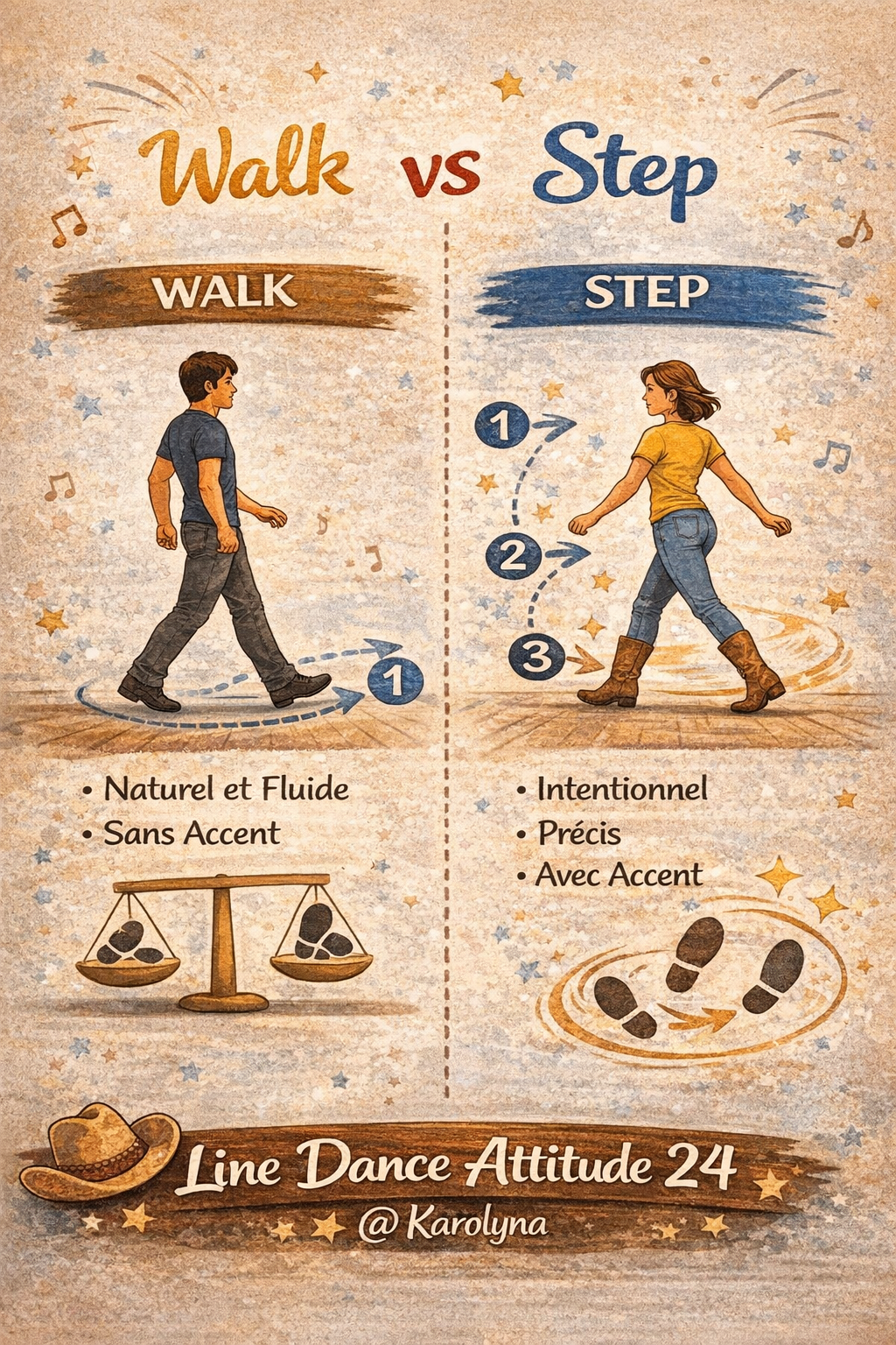 Le Walk en line dance, c'est exactement ce que le mot dit " marcher". Un pas naturel, fluide, qui déroule le pied du talon aux orteils (ou des orteils au talon selon le style), sans accent particulier, sans marquage fort. Le walk circule. Il transporte le corps d'un point A à un point B avec la fluidité d'une personne qui se promène.